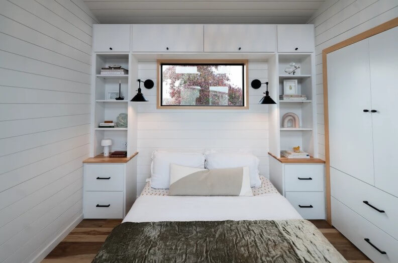 Neste modelo, o dormitório é espaçoso e, graças ao layout de um único andar, tem área suficiente para que ocupantes que sejam mais altos possam ficar em pé. O quarto também tem uma cama de casal, amplo espaço de armários, incluindo guarda-roupas integrados, e uma porta envidraçada para acesso direto ao exterior.